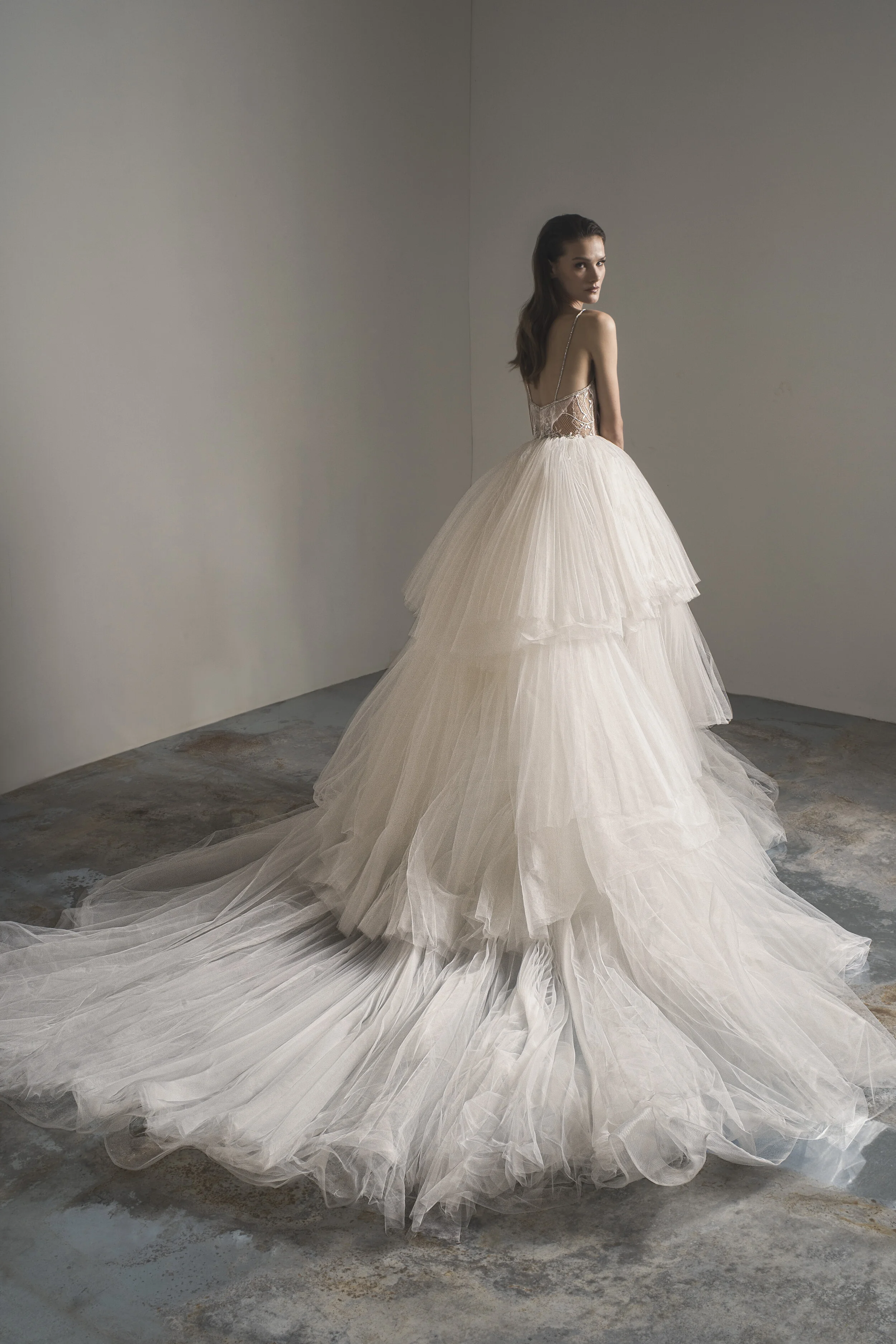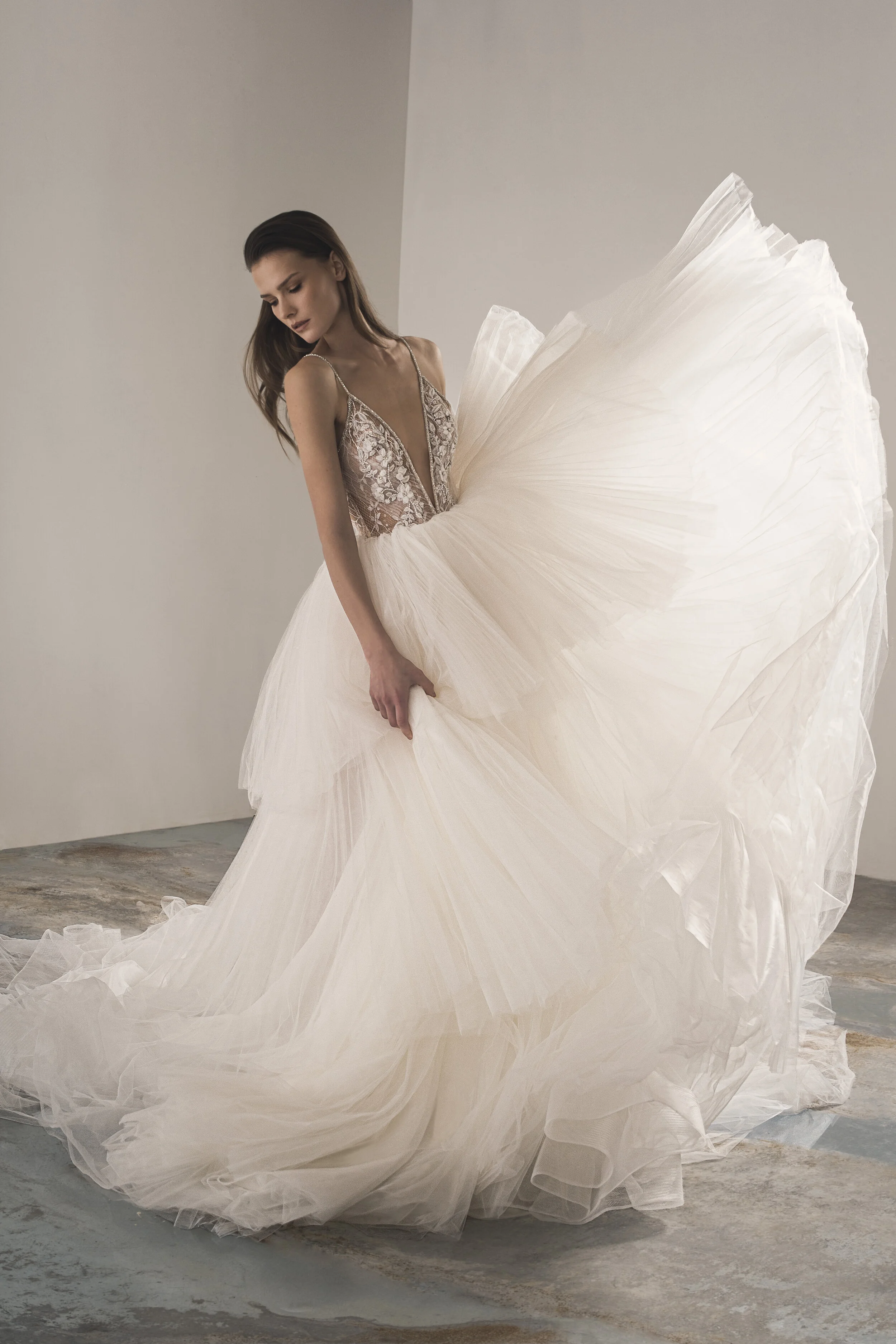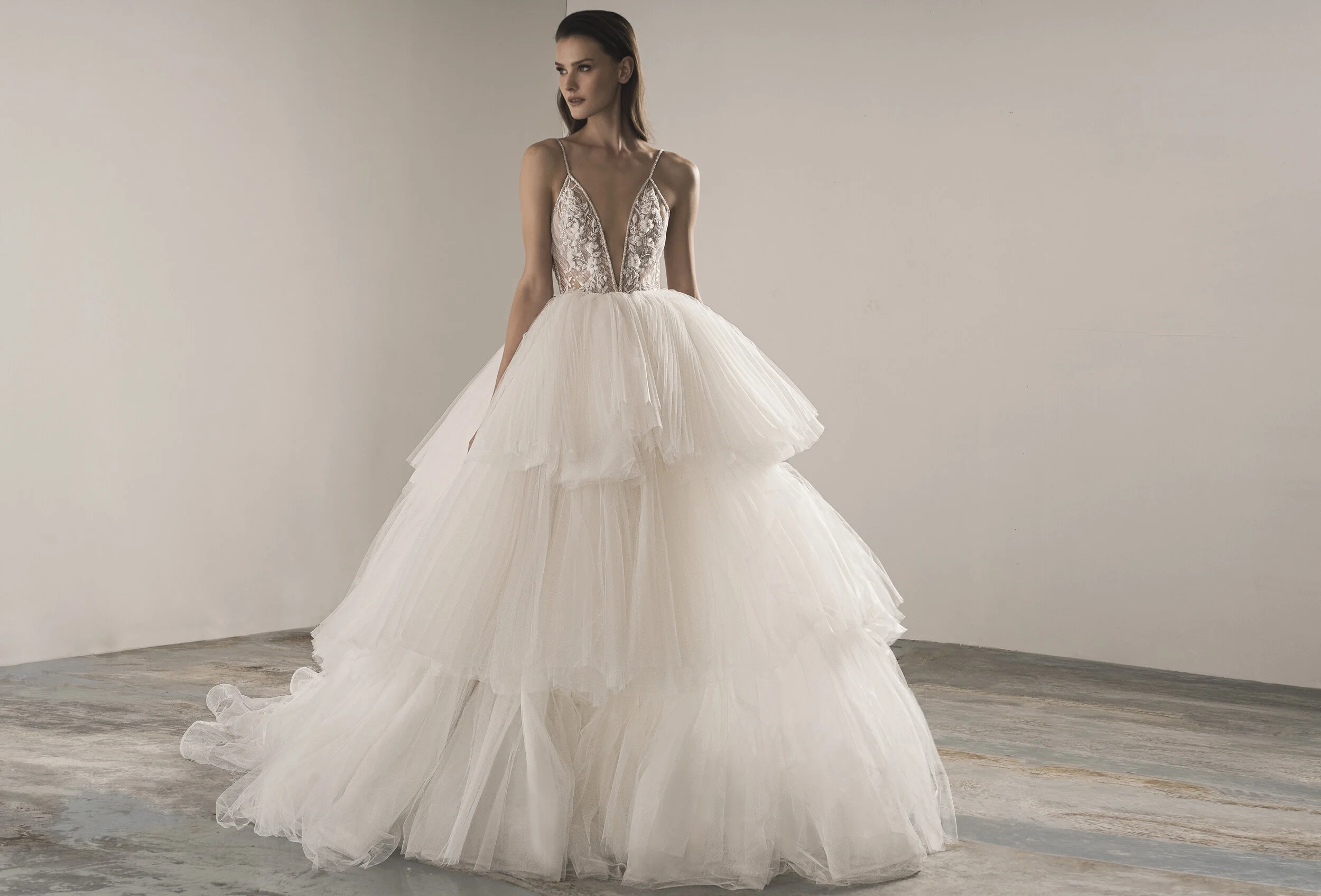 Princess gown featuring layers upon layers of tiered tulle, a plunging V neckline, beaded straps, and floral beaded bodice.