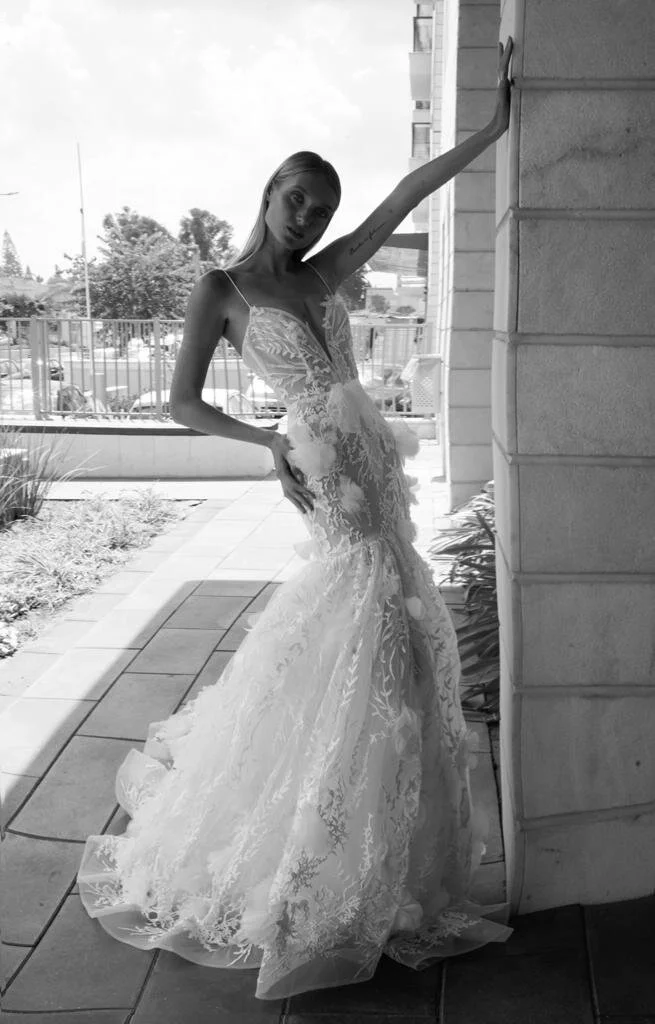 Fit and Flare gown featuring spaghetti straps, corseted bodice with V neckline, floral motifs, 3D cotton-like florals, and bow at waist on the front of dress.
