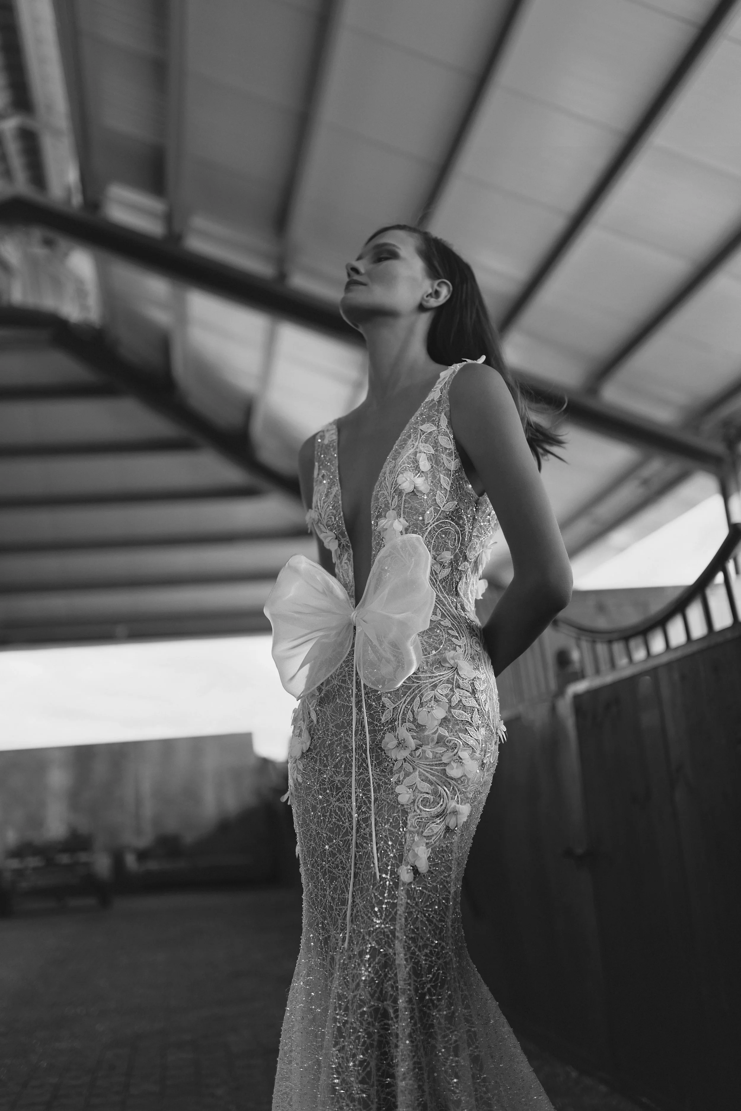 Mermaid gown made of beaded lace, featuring a plunging neckline, open V back, floral embellishments, oversized organza bow on front of waist, and a detachable organza overskirt.