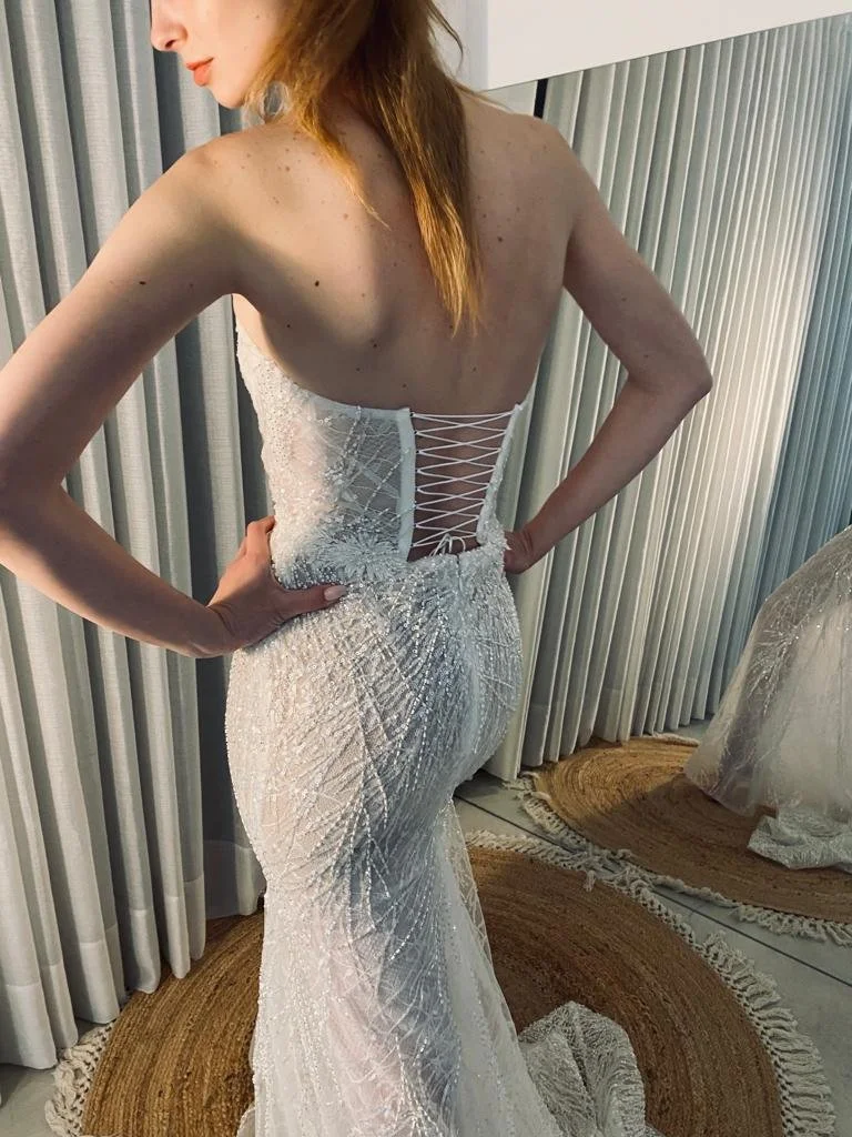 Daisy Beaded mermaid wedding gown featuring a strapless corset with exposed boning, lacee-up back, and train. View fullsize