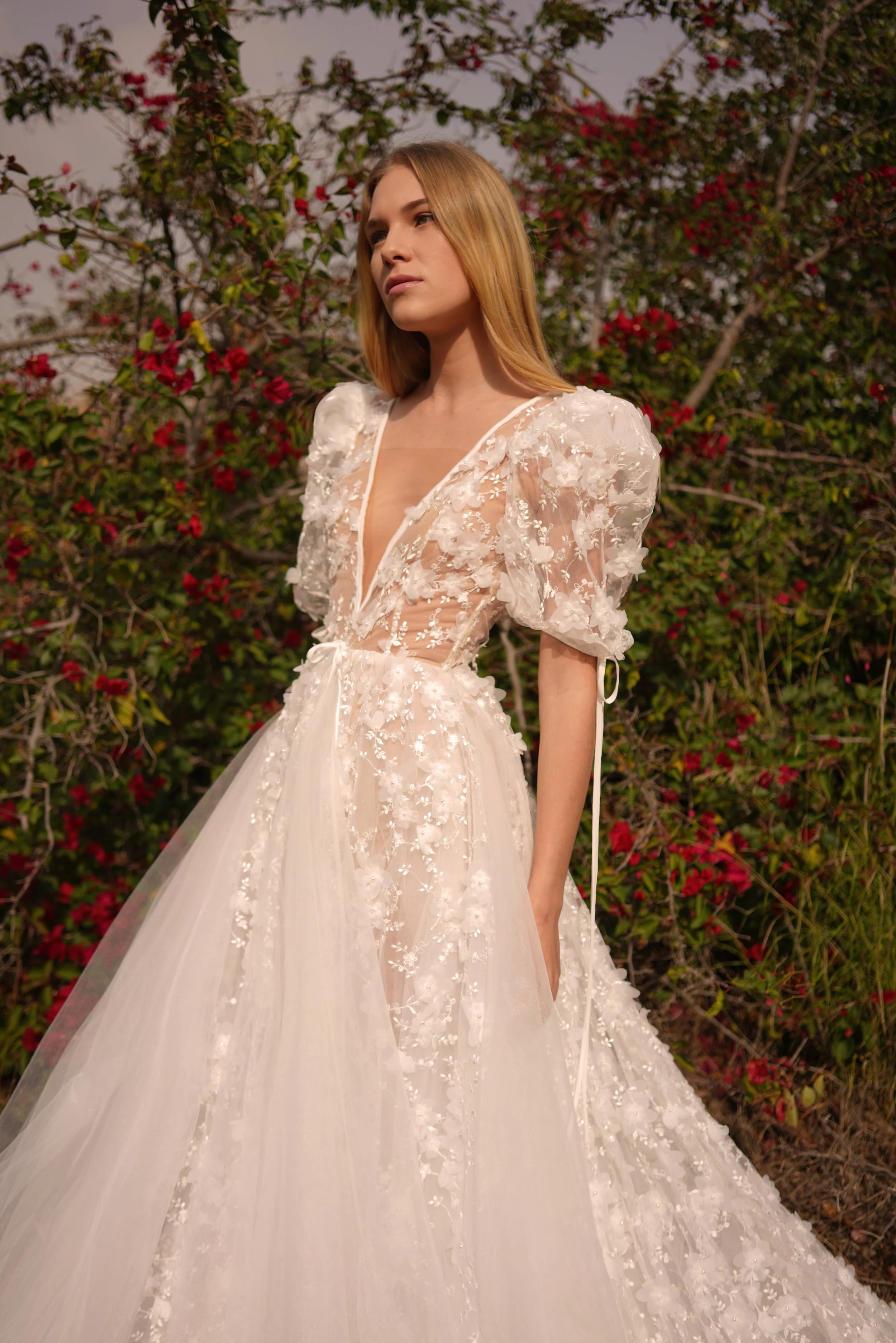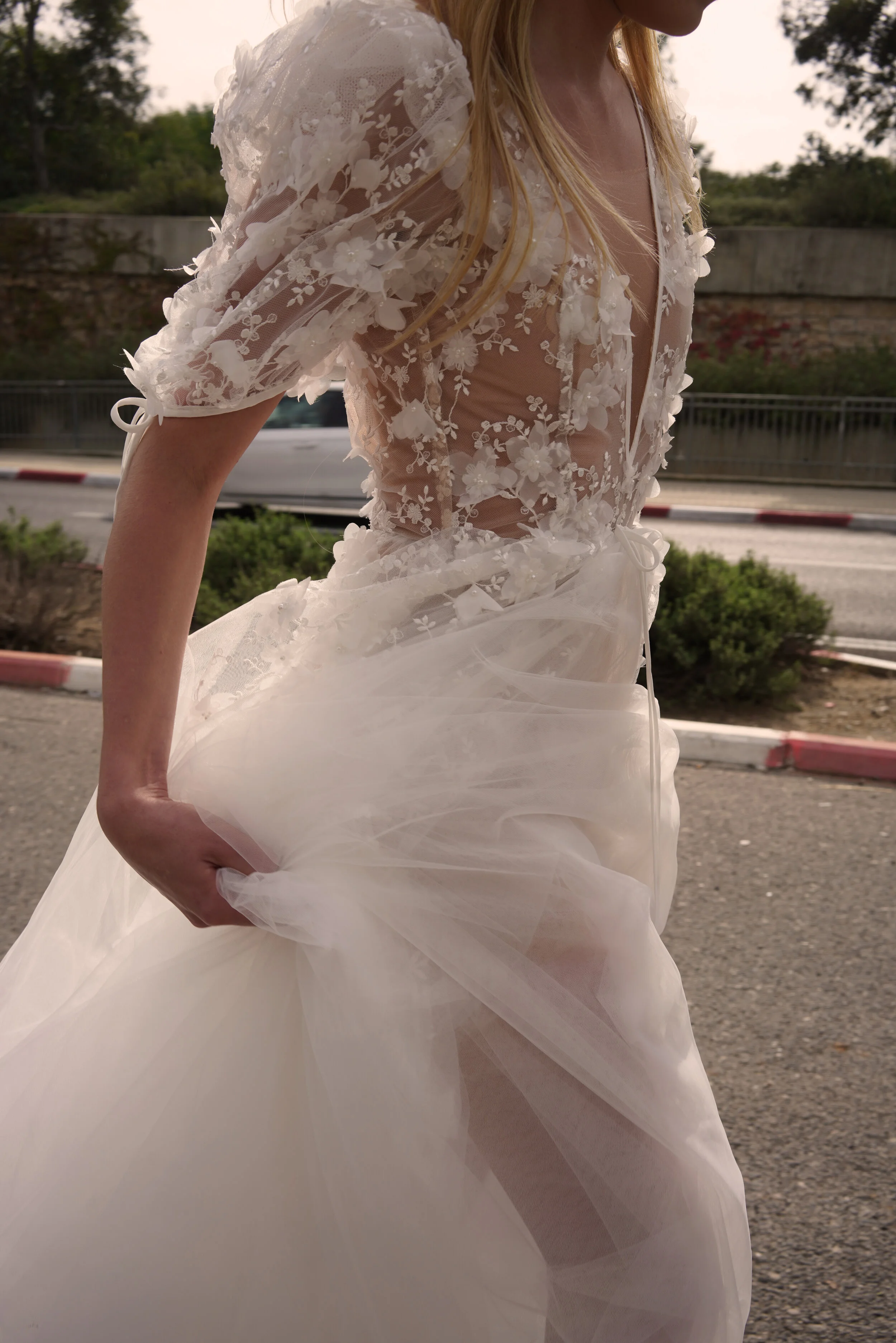 Tulle princess gown featuring a plunging V neckline and open V back, 3D floral motifs, sleeves and long train.