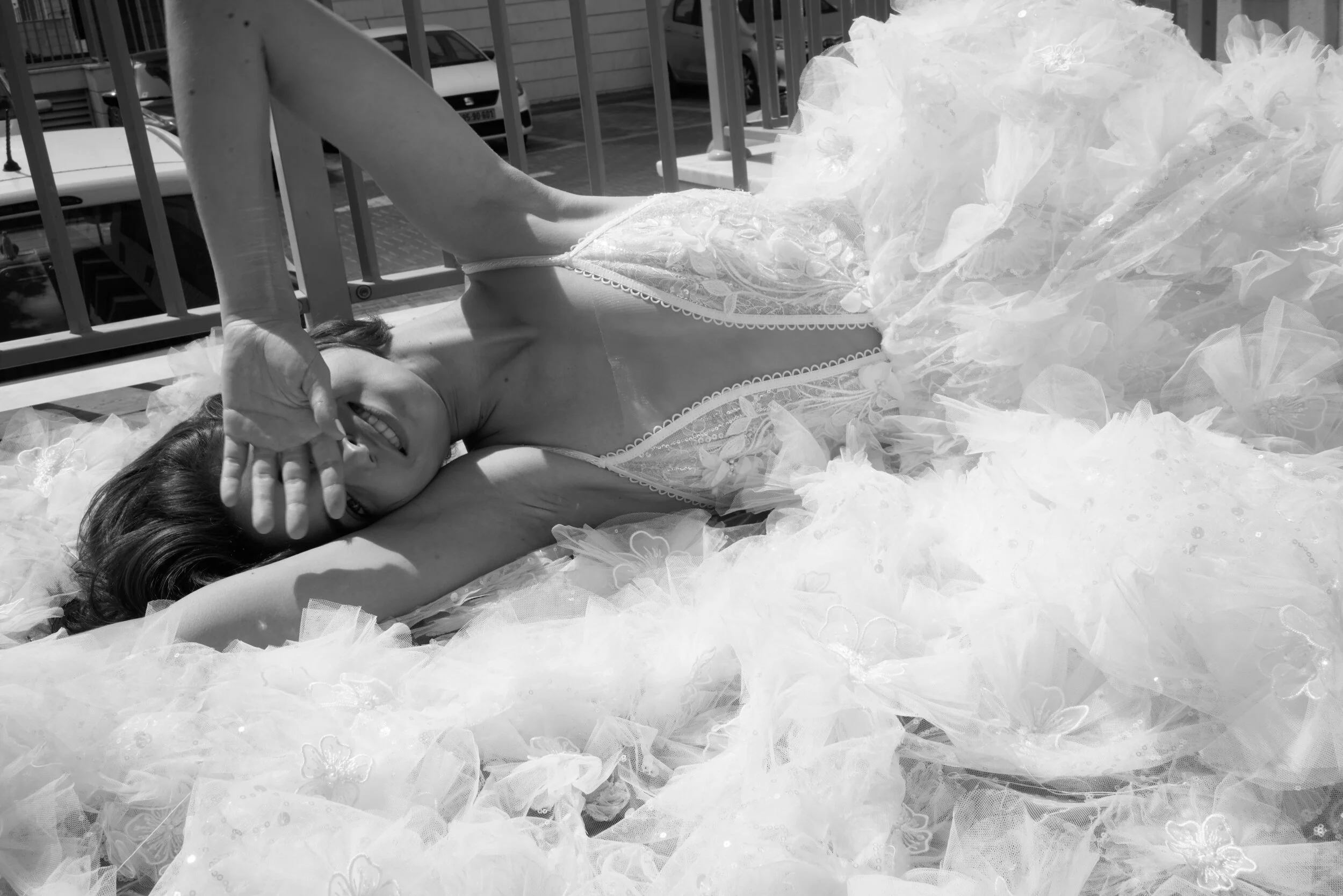 Floral Cloud Tulle sparkly princess gown with 3D tulle florals, sequins, plunging V neckline, spaghetti straps.. View fullsize