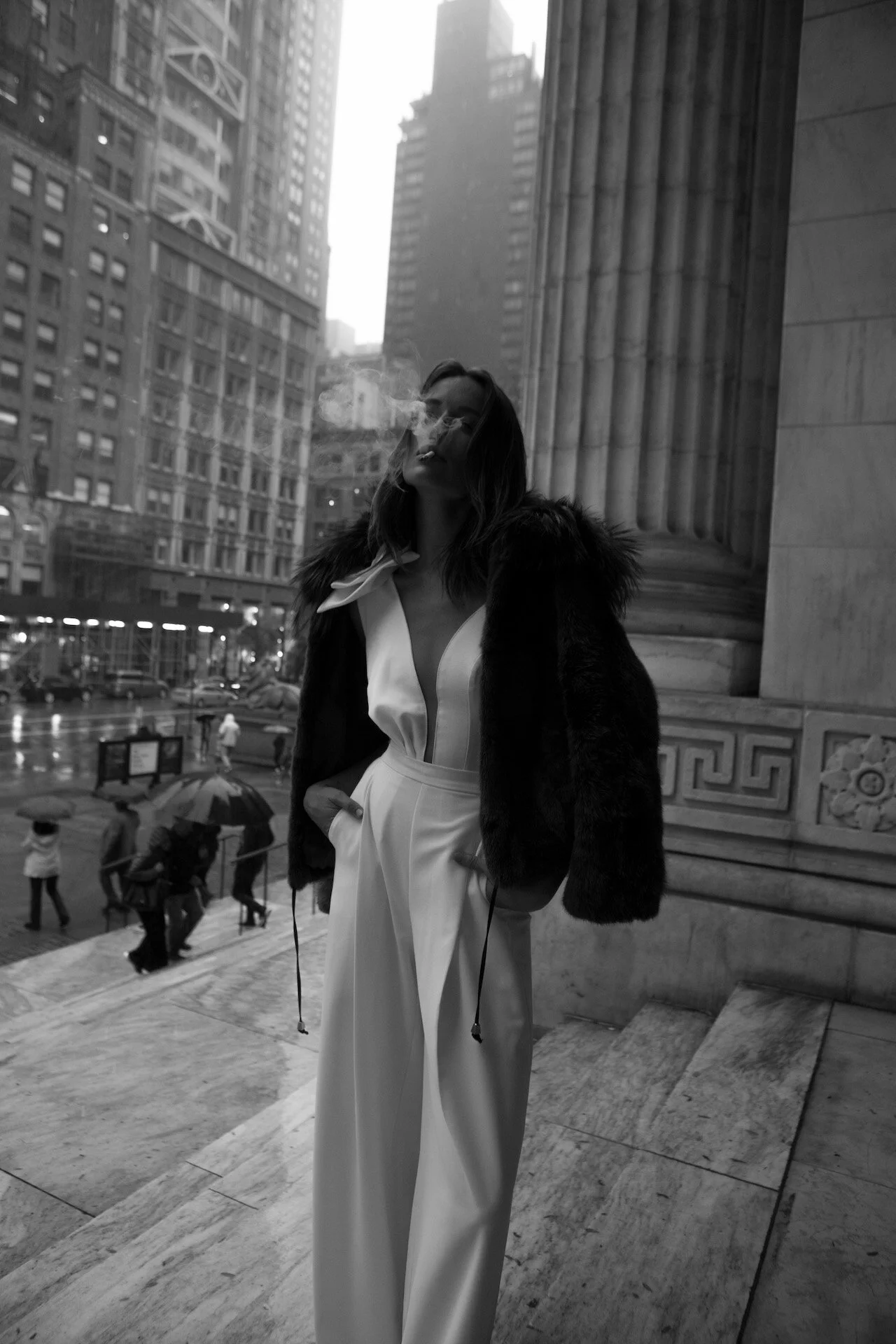Loren Bridal jumpsuit featuring a plunging neckline, pleated trousers with pockets, and an oversized bow on one shoulder. View fullsize