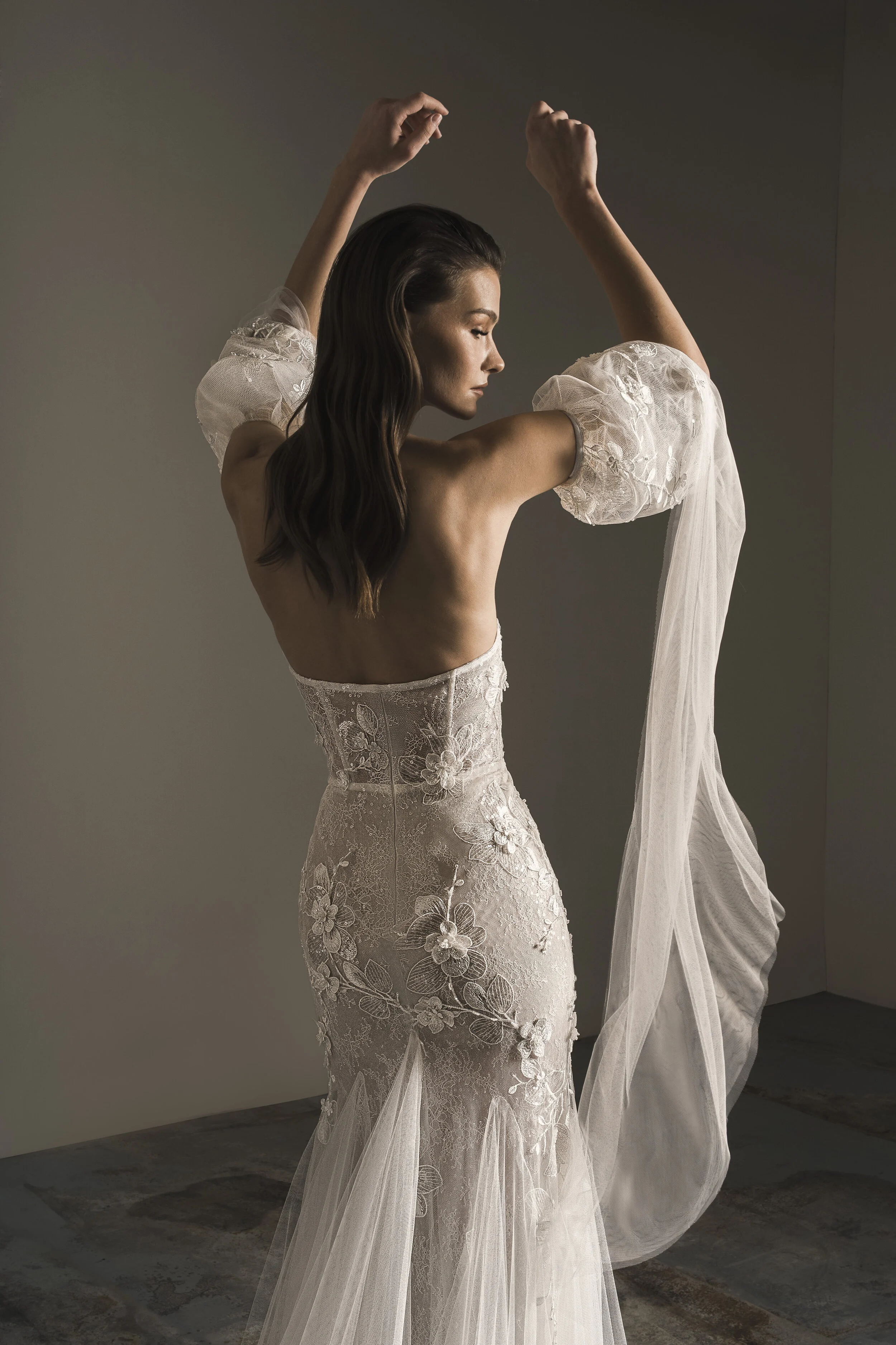 Mermaid wedding gown with strapless corset top, adorned with 3D beaded floral details on French lace. The skirt features tulle godets, and tulle train, and detachable balloon sleeves with long tulle accent.