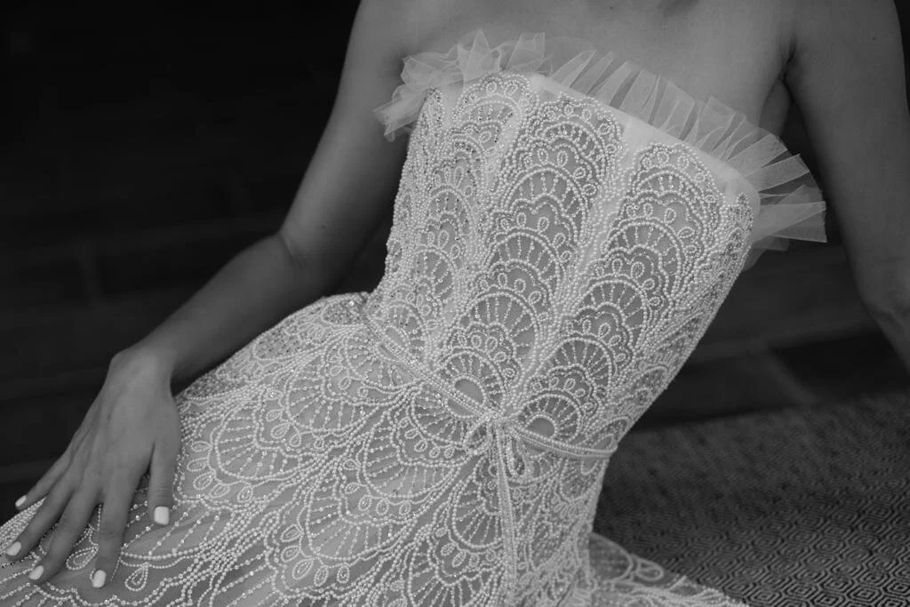 Pearl Storm Pearl encrusted A-line gown, strapless with straight neckline adorned with tulle trim, dainty belot. View fullsize