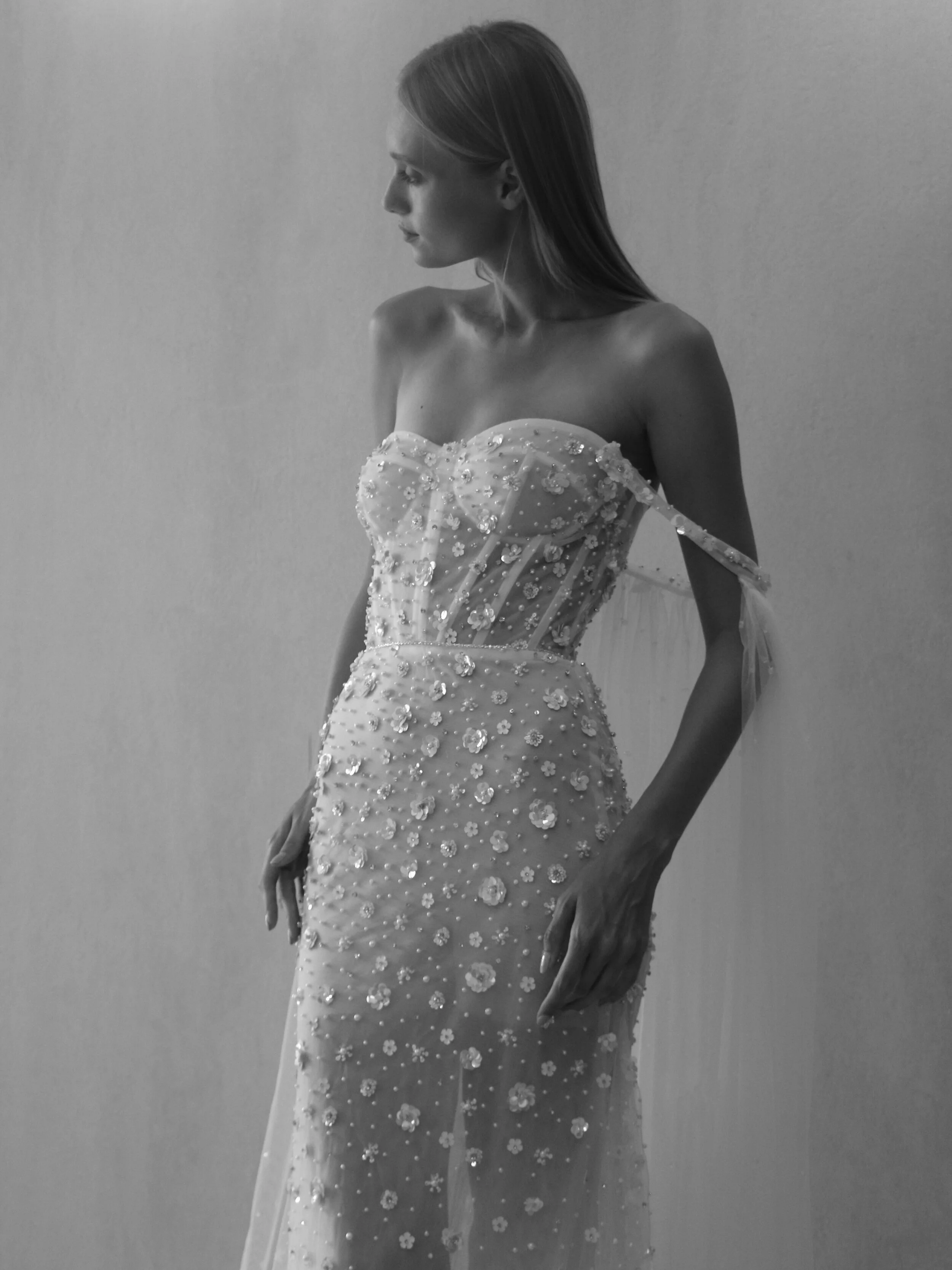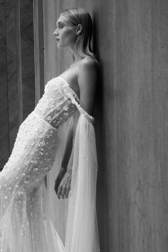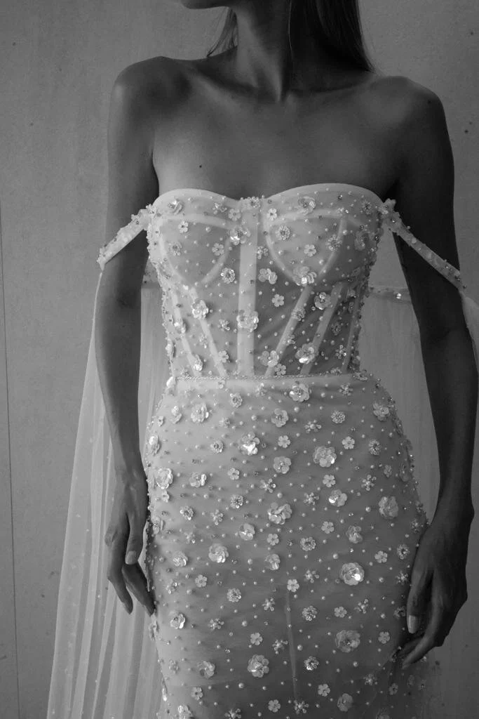 Mermaid gown with off the shoulder beaded straps with tulle cape, corset top, sweetheart neckline, entirely embellished with pearls and small 3D florals.
