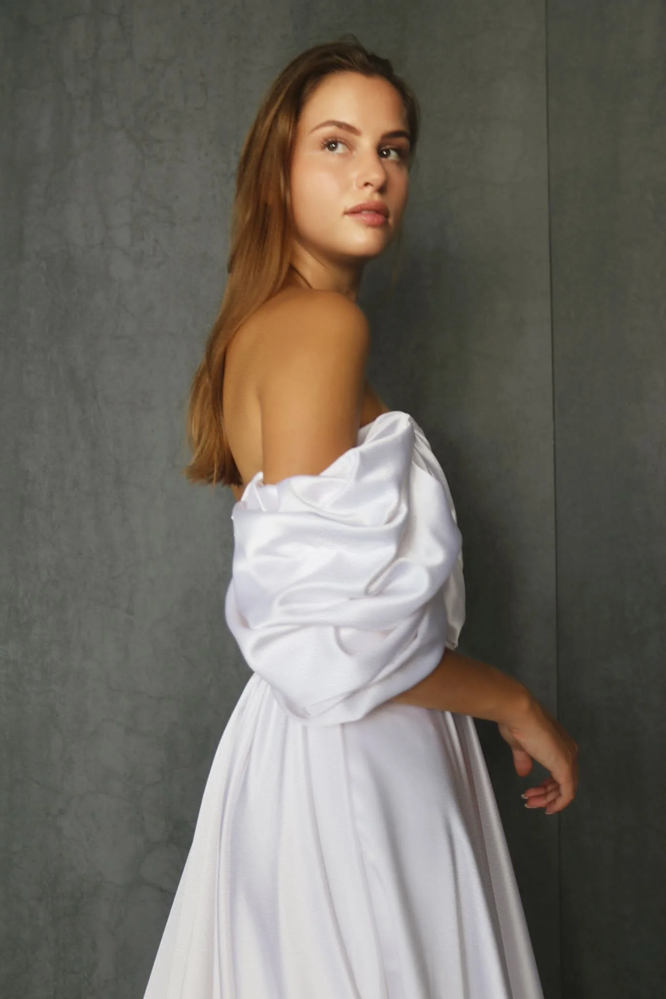 Dramatic sheath gown with draped bodice, one-shoulder sleeve, flowy skirt has a thin belt, features a sultry slit and train.