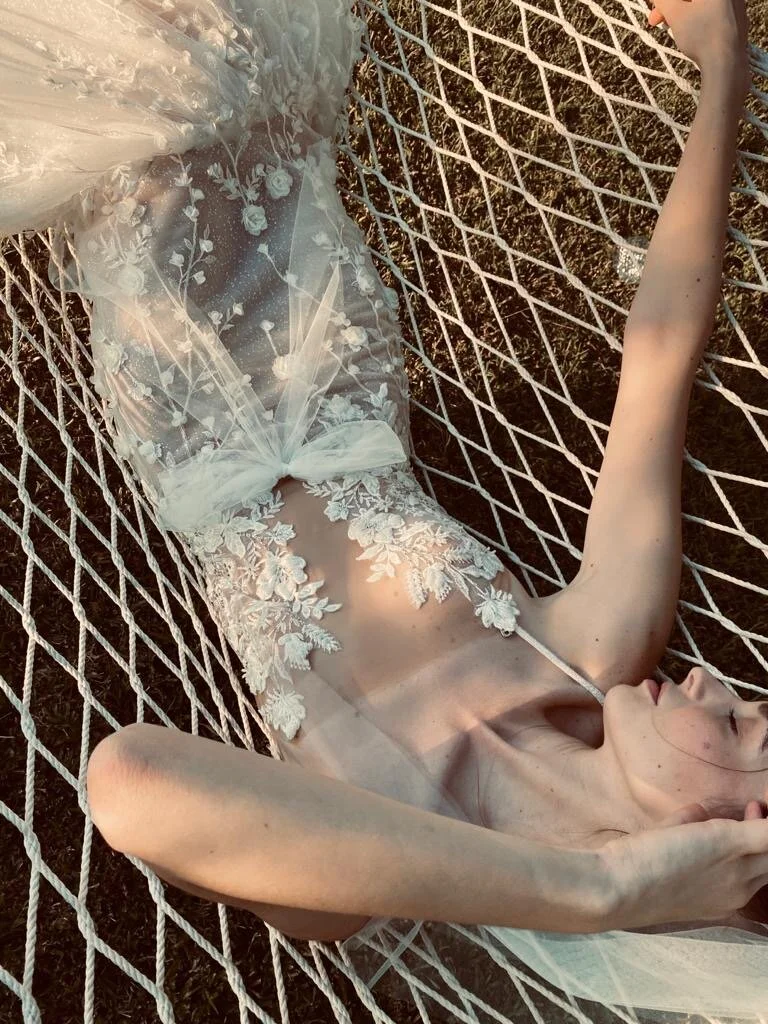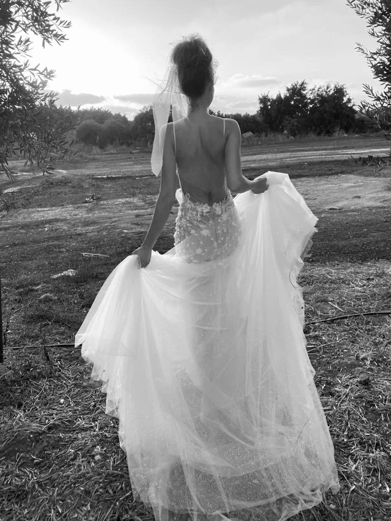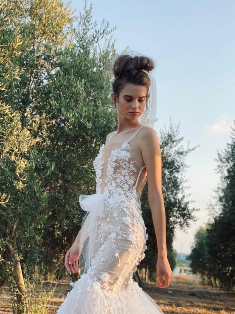 Sultry fitted gown covered in 3D floral details, open neckline, low open back, spaghetti straps, and accent bow on front of waist.